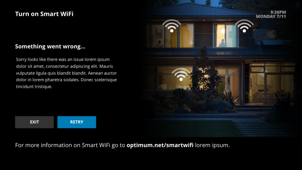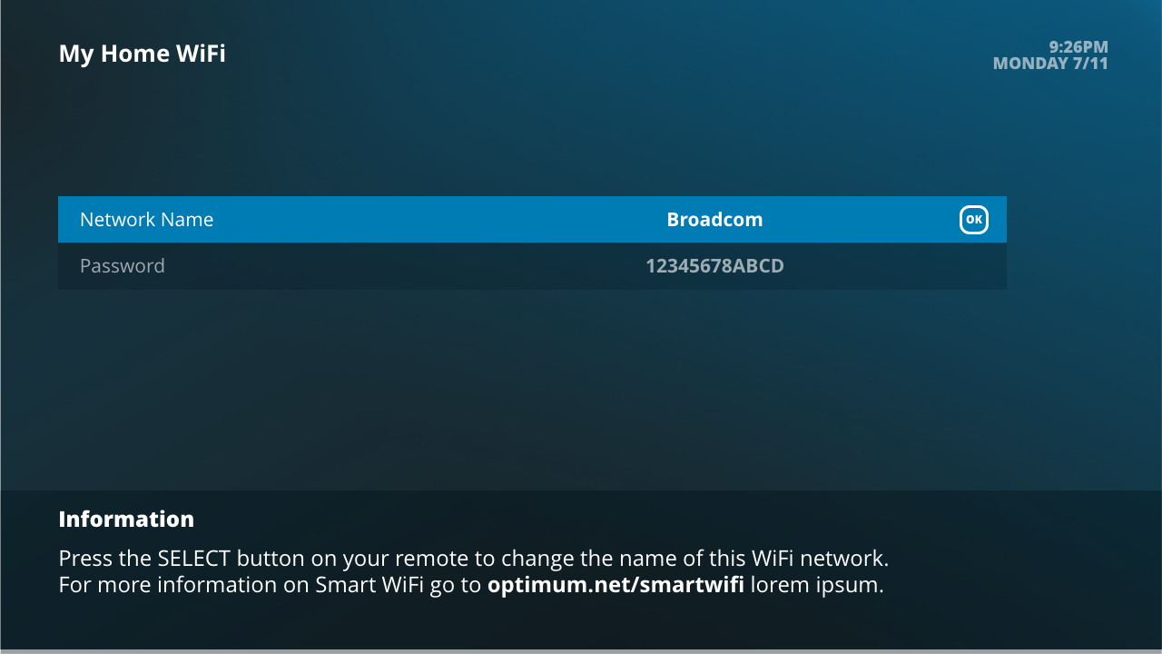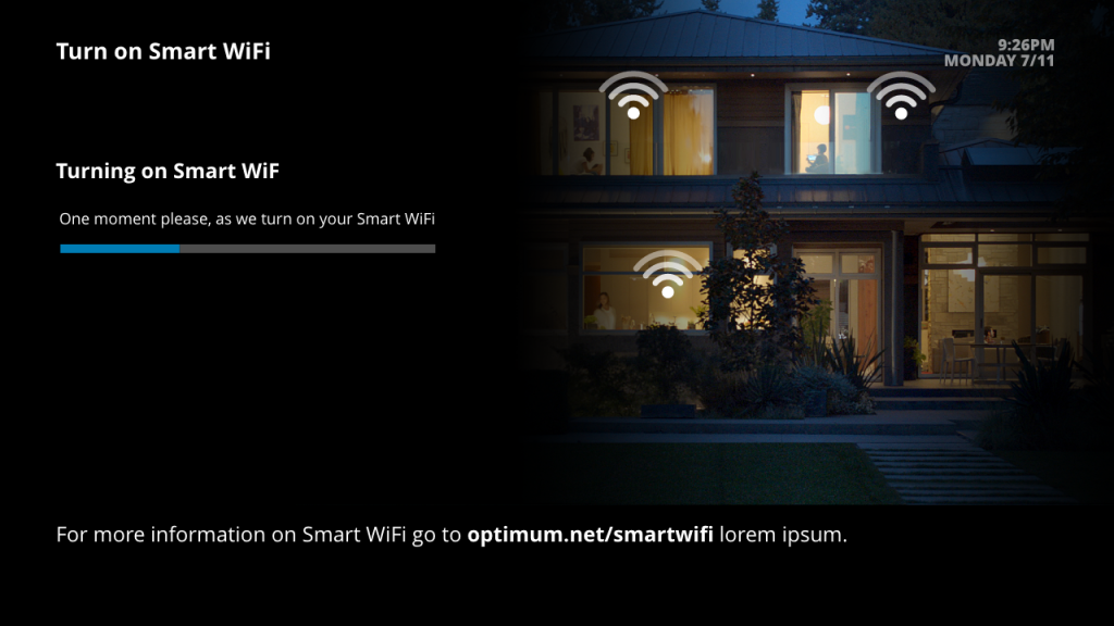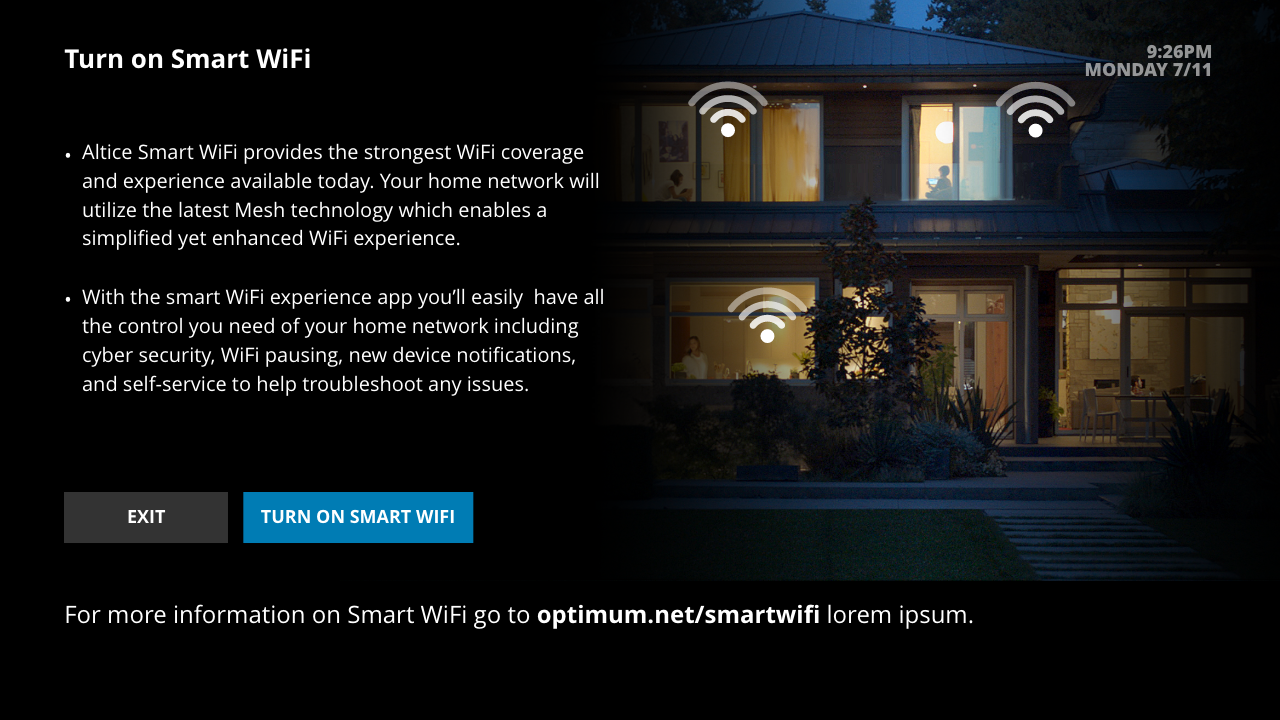 Altice was rolling out Smart WiFi, a new service that automatically connected devices to the optimal WiFi band (2.4 GHz or 5 GHz). Unlike the older system where users had to choose between two separate bands, Smart WiFi simplified the experience by presenting only one unified network. To support this rollout, the TV UI needed a way to educate users about Smart WiFi and guide them through enabling it.